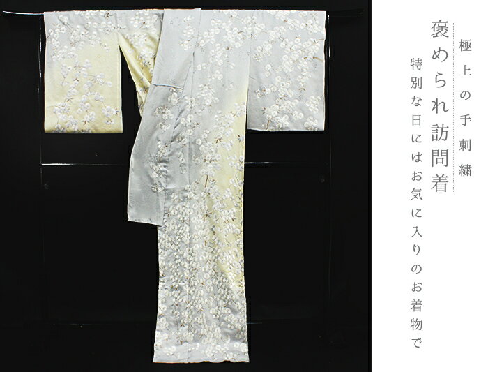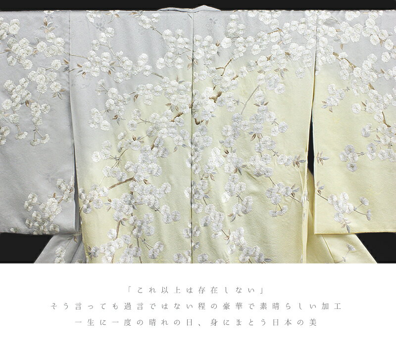 訪問着 極上 手刺繍 正絹 桜 さくら 八重桜 ライトグレー クリーム色 ぼかし 綸子 最高級ちりめん 未仕立て 仮絵羽 上品 エレガント フォーマル 結婚式 パーティー 礼装 入学式 卒業式 入園式 卒園式 七五三 お宮参り 2-0134 サイズ表 サイズ cm 最大身丈(肩から) 約175cm 最大桁丈 約72cm 反物幅 約38.5cm 商品詳細 ■素材 ・正絹 ・最高級ちりめん ・金糸 ■詳細 ・友禅ぼかし染め ・極上 手刺繍 ・綸子 ・金彩加工 ・銀通し ・共八掛付 ■カラー ライトグレー クリーム色 ■合せる帯 袋帯 ■着用シーン 結婚式 入学式 卒業式 入園式 卒園式 七五三 お宮参り お茶会 パーティー 観劇 映画鑑賞 状態 ■新品・未仕立て品 染め刺繍し上がったばかりのお品です。
